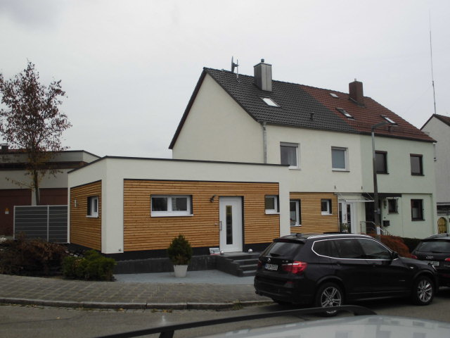 Eine massive Doppelhaushäfte wurde 2015 mit einem erdgeschossigen Holzanbau erweitert.